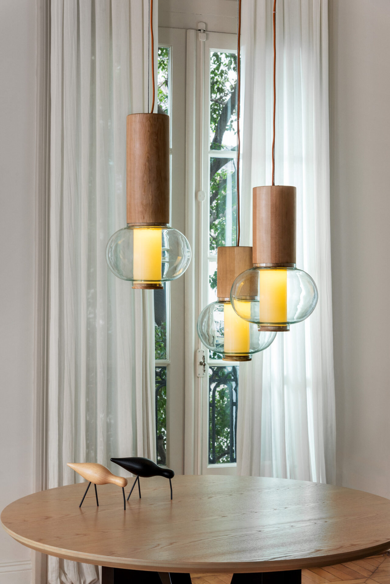 This lamp draws inspiration from the natural world, combining the warmth of wood with the delicate beauty of blown glass to create a harmonious and inviting light. The wooden structure, carefully crafted by hand, evokes a sense of organic simplicity, grounding the piece in the earthy textures of nature. The blown glass, with its soft, translucent finish, encases the light, diffusing it into a golden glow that fills the space with a sense of tranquility and warmth.