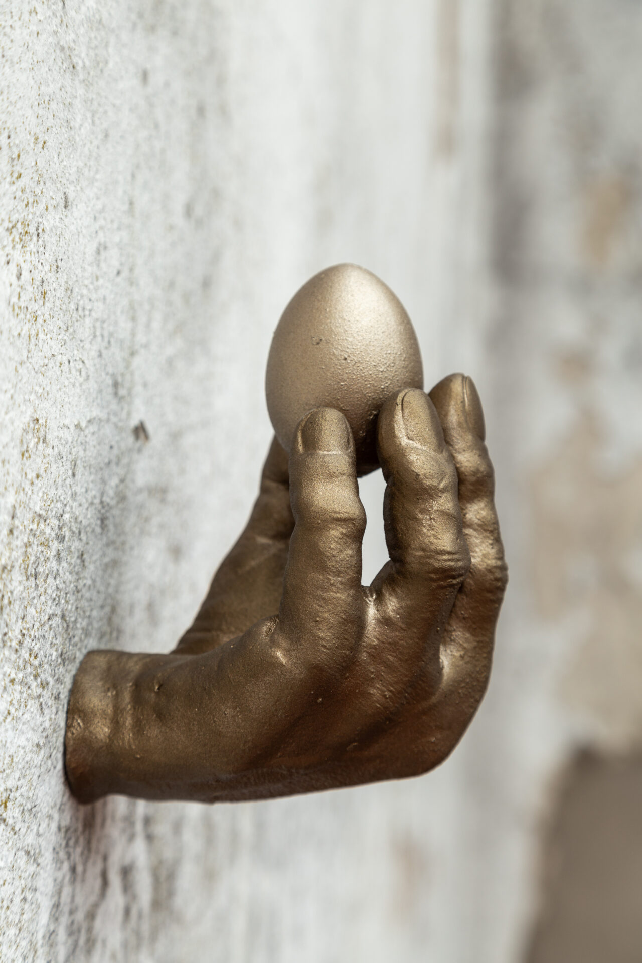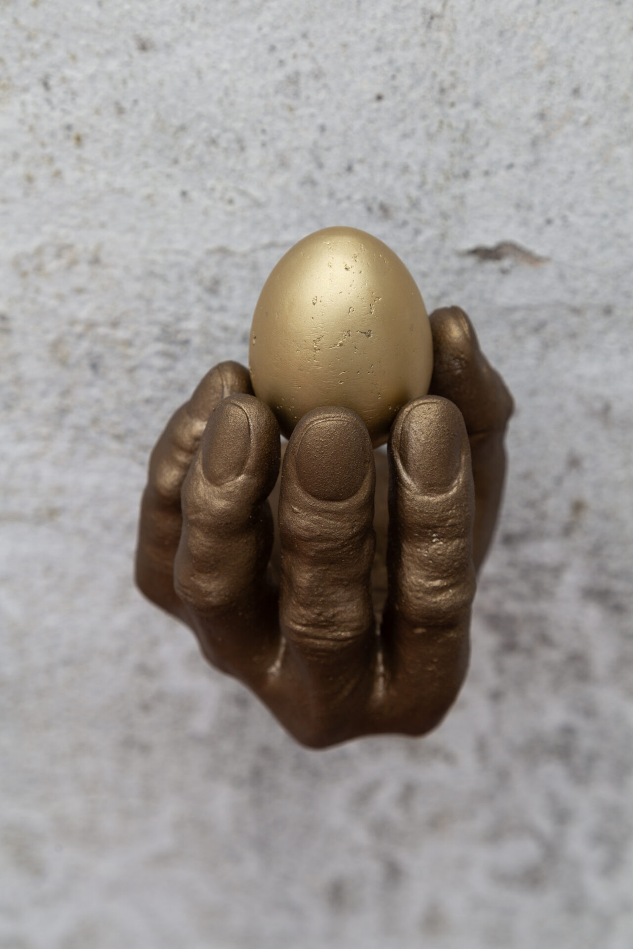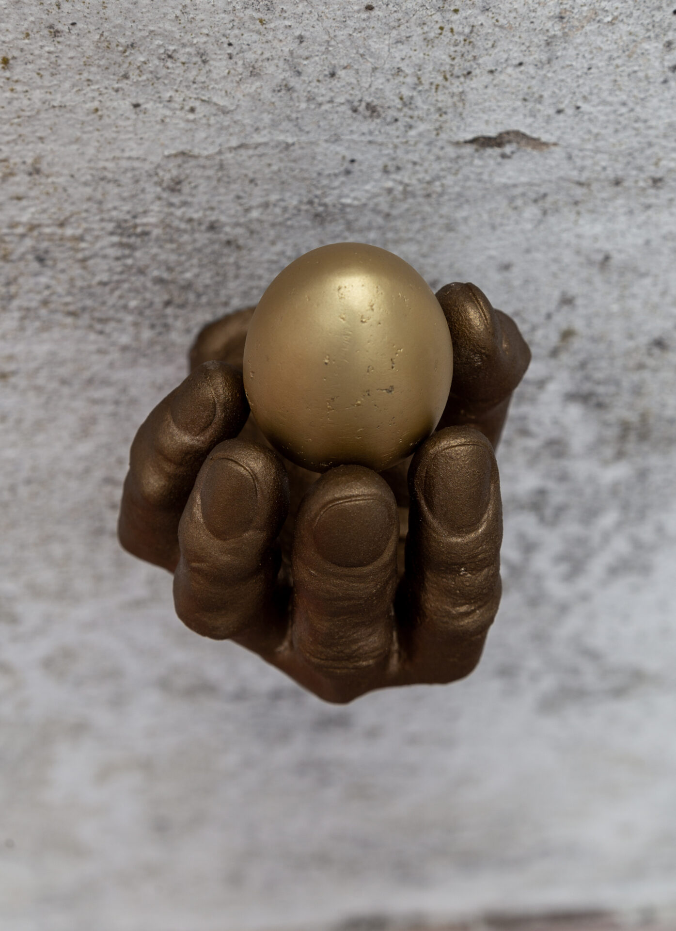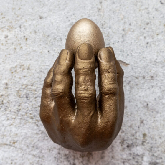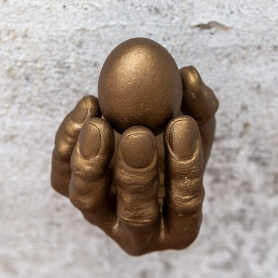 Rottenberg’s signature focus on the fragility and tenderness of the human body is encapsulated in this sculptural representation of a hand cradling an egg. Much like Rottenberg’s work, which often explores delicate and intimate moments of connection, this sculpture captures the fine balance between strength and fragility. The hand, with its careful grip, suggests a reverence for life, a theme that Rottenberg often explores through the tactile representation of human and organic forms. The egg, symbolic of creation and potential, is held with utmost care, a direct reflection of Rottenberg’s fascination with the primal instincts that drive human behavior. Through the combination of digital sculpting and traditional bronze casting, this piece speaks to the artist’s approach of fusing ancient craftsmanship with contemporary sensibilities, creating a work that invites the viewer into a moment of quiet contemplation.