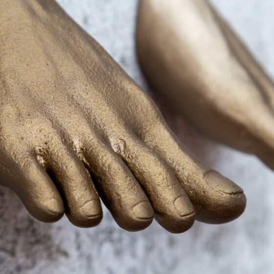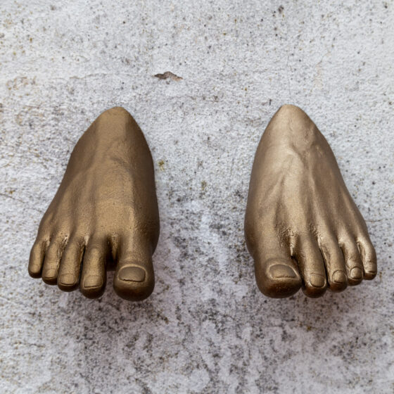 This set of three bronze sculptures is a direct response to the emotive, visceral work of Israeli artist Enrique Rottenberg. The pieces— a pair of female feet, a hand, and a hand holding an egg— are deeply influenced by Rottenberg’s exploration of human form, touch, and the primal connection between the body and its environment.